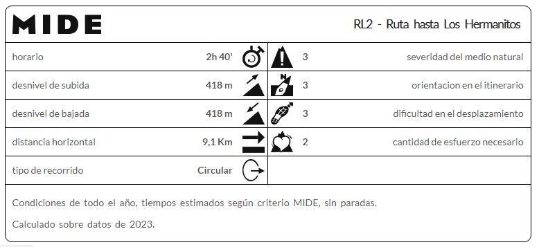 Los Hermanitos tienen una altura de 1.300 msnm a los que ascendemos por la ruta que recorre la ladera de la sierra. Partimos de la Plaza Mayor situada a 880 msnm, por lo que ascenderemos unos 400 metros a lo largo de tres kilómetros y medio